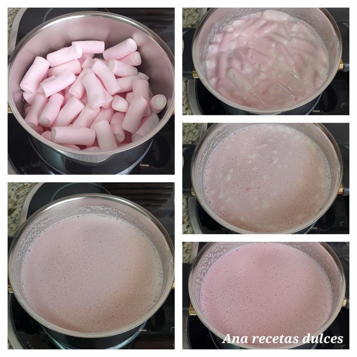 Echamos en una olla la nata (crema de leche), la leche y las nubes, ponemos a fuego medio y removemos continuamente hasta que las nubes estén totalmente fundidas (no tiene que hervir).