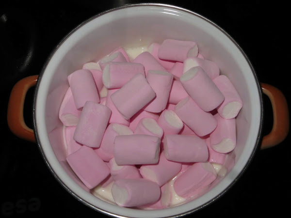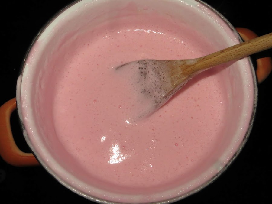 En un cazo a fuego medio bajo echamos la leche y las nubes y esperamos a que se deshagan, no dejéis de darle vueltas para que no se peguen. Una vez que están deshechas, sacamos y reservamos. Si queréis un color rosa más fuerte es el momento de añadirle unas gotitas de colorante rojo.