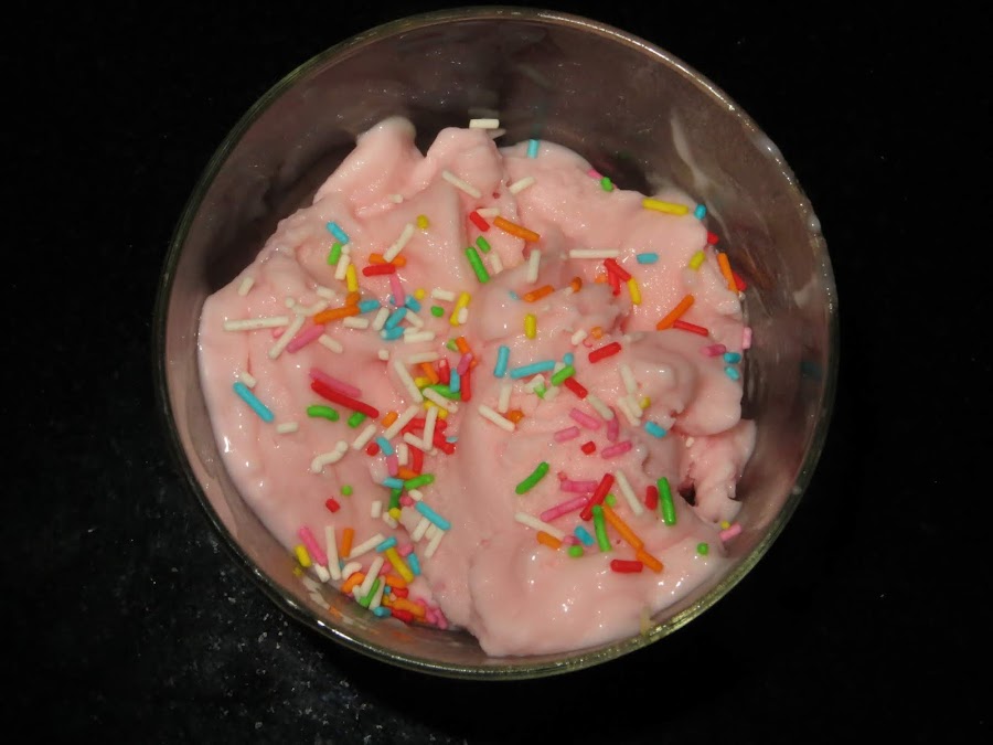 Luego mezclamos las dos composiciones y una vez que tengamos la heladera lista, daros cuenta que tenéis que meter el día anterior la cubeta al congelador, echamos la mezcla y la dejamos alrededor de 20 minutos y ya está lista para consumir o congelar si queremos utilizarlo más adelante.