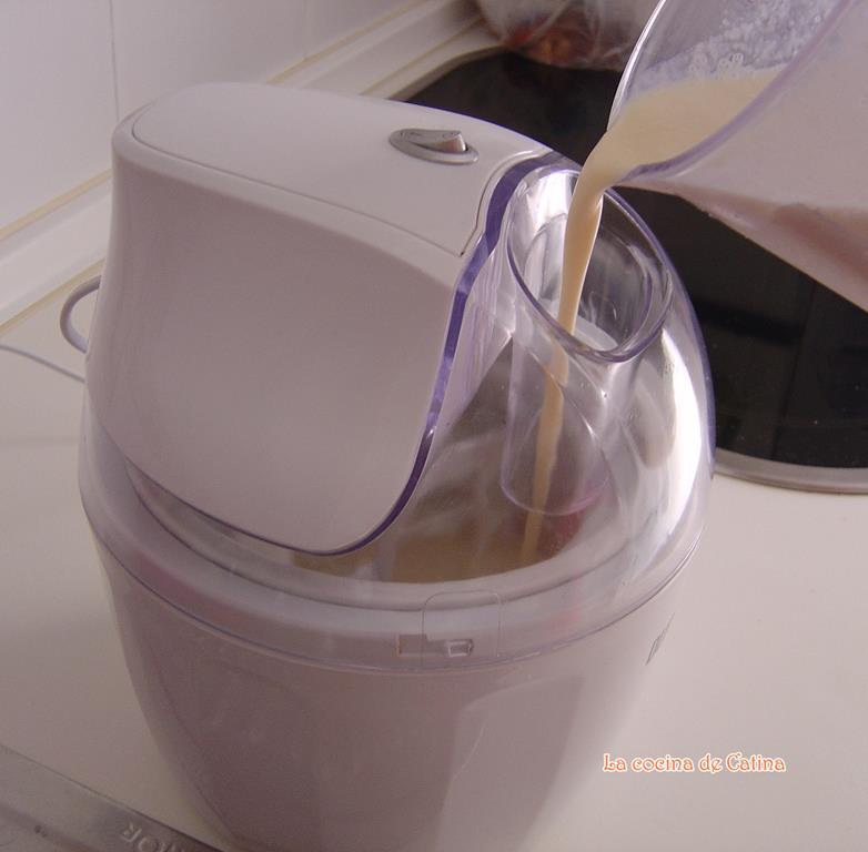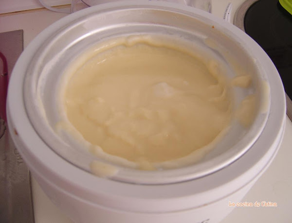 Mantenemos la heladera en marcha durante 30 minutos. Cuando se solidifique se para la máquina, se le quitan las aspas y se pasa la cubeta al congelador otras 4 o 5 horas.