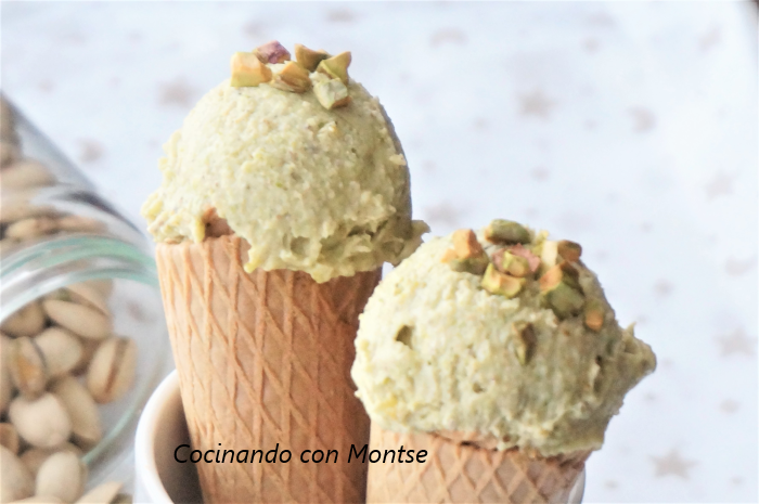 He utilizado pistachos naturales, ya los venden asín y para acompañar el helado pongo pistachos tostados, pero si no encontráis se pueden poner los tostados para todo.