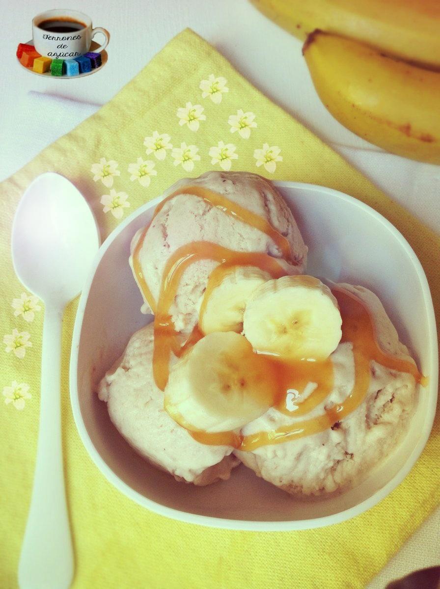 Y por último, en un recipiente ve alternando la pasta de plátano con el toffee, de manera que puedas encontrar caramelo por toda la preparación. Y hay que ponerlo a congelar de nuevo. Se puede estar en el congelador por largo tiempo y solo sacar lo que vayas a comer en ese momento. Yo aquí debo confesar que probé de congelarlo por separado (la pasta de plátano por un lado y la salsa de toffee por otro) con la intención de cortar a trocitos el caramelo y así encontrarlos con cada cucharada de helado, pero fracasé. No sé el motivo pero el toffee no cuajó. Así que al final opté por prepararlo como te he dicho. Y la verdad es que es una combinación fabulosa. También puedes escoger tener el helado en el congelador y a la hora de servirlo, ponerle un chorrito de toffee por encima, como puedes ver en la foto: