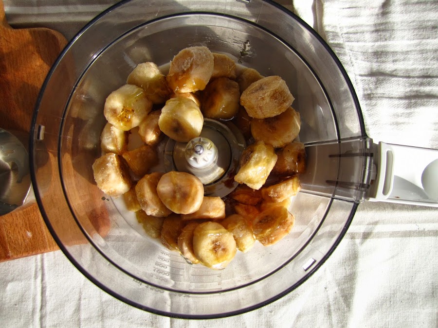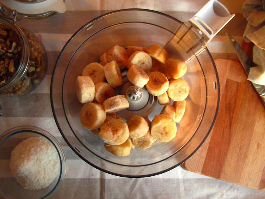 PREPARACIÓN1. Pela y trocea los plátanos y coloca los discos sobre una bandeja cubierta de papel de horno de uno en uno. Mete al congelador al menos 3 horas. (Pasadas las 3 horas, cuando los plátanos estén congelados, y si no los vas a usar al momento mételos en una bolsa de congelado y guárdalos en ella hasta el momento de usarlos)