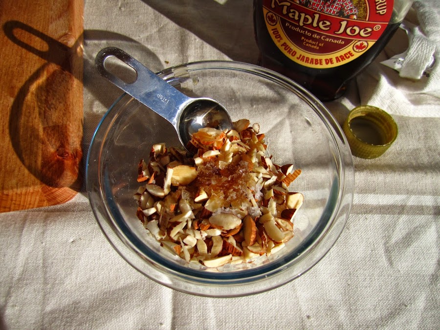 2. Mezcla en un bol las almendras, 2 tsp del jarabe y la sal.