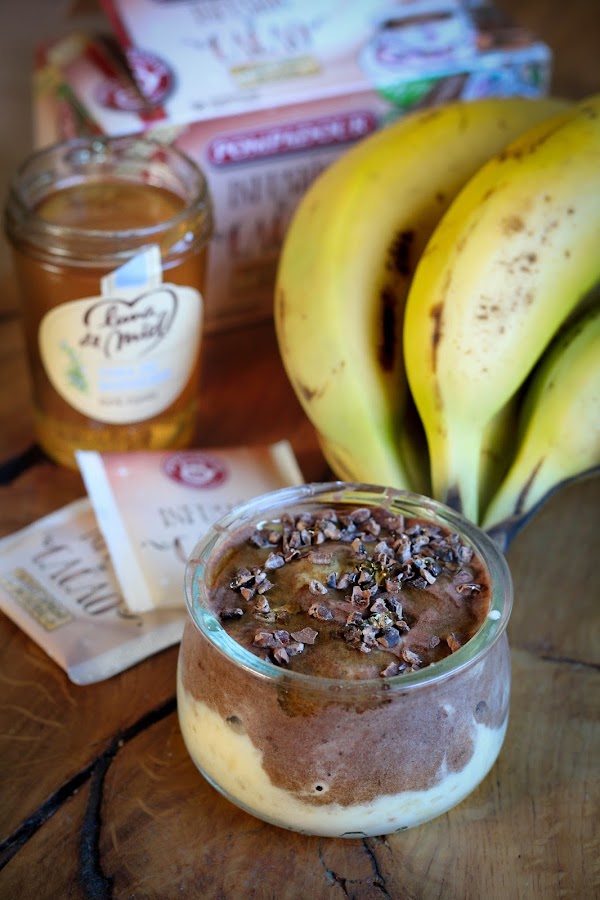 Ponemos encima del helado los nibs de cacao y la cucharadita de miel que le aportará el toque crujiente combinando de maravilla. Disfrutamos sin remordimientos de conciencia.