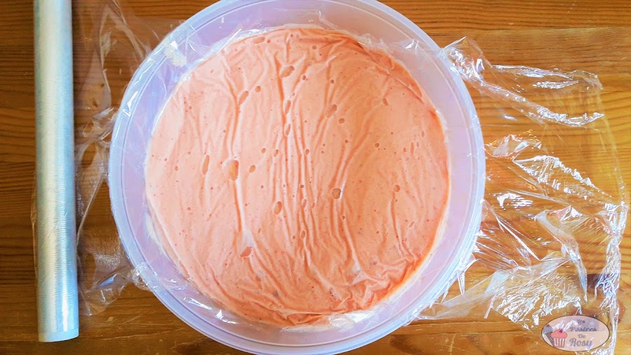 - Ponemos la crema resultante en un recipiente plástico amplio, cubrimos con film de plástico y lo llevamos al congelador hasta el momento de consumir.