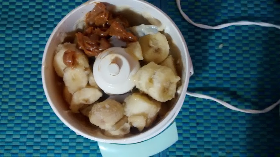 Añadir los trozos de plátano junto con el manjar en una moledora de alimentos. Procesar hasta formar una pasta. Yo tuve que repetir el procedimiento ya que no cupieron todos los trozos de plátano de una sola vez.