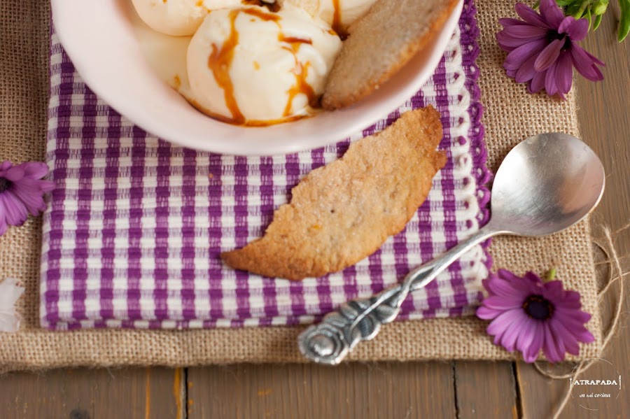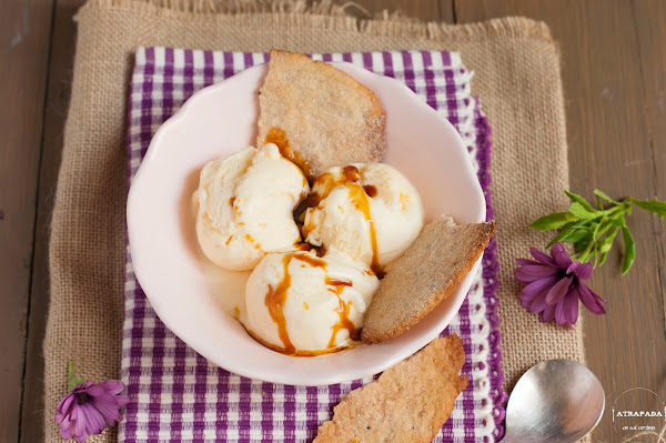 Mes y medio ha estado en la carpeta de pendientes este helado, desde que lo probé en la Taberna del Volapié. Ya os acordaréis que también publiqué unas hamburguesas de rabo de toro que probé también allí. Pues estas dos recetas tienen un ingrediente común, que es el queso de cabra Payoyo, que esta vez ha sido usado para una preparación un tanto rara para este tipo de queso. No os podéis imaginar lo bueno que está este helado, de por si, si os gusta el queso de cabra curado os gustará el sabor del helado, pero es que además ha sido combinado con estas tortas de aceite sevillanas caseras, que ya publiqué en su día y cuya receta podéis ver aquí. El contraste es buenísimo, aunque he querido rizar el rizo y acompañarlo de un vino, y no un vino cualquiera, el único vino que ha formado parte del menú de la gala de los premios Nobel, el Victoria nº2, de las bodega malagueña de Jorge Ordoñez, de la que os hablaba cuando os enseñé mi visita a la vendimia de la Axarquía malagueña. Además puede ponerse algún que otro galón más, ya que se sirvió en el 88 cumpleaños de la reina de Inglaterra y ha sido también servido en la Gala Medalla de Oro 2013 del Instituto Español Reina Sofía de Nueva York concedidas a la estadista Hillary Clinton y el actor español Antonio Banderas. Pero el secreto de su éxito está en que procede de una selección de viñedos viejos situados en los puntos más elevados del término municipal de Almáchar. La cosecha, se lleva a cabo de forma manual a mediados de agosto. La fermentación se realiza en su totalidad en depósitos de acero inoxidable y, como es característico de este tipo de vinos, su alcohol procede exclusivamente de la fermentación de la uva; ésta se detiene por disminución de la temperatura una vez alcanzado el grado de alcohol deseado. Se trata de un vino blanco naturalmente dulce, variedad 100% Moscatel de Alejandría, con fermentación en acero inoxidable y alcohol del 10%. Se encuentra en el mercado a un precio de 15 euros aproximadamente la botella de 375 ml.