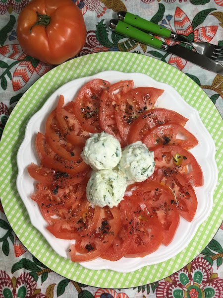 Se lavan, secan y cortan los tomates en gajos. Se salpimentan, se añade un chorreón de aceite de oliva virgen extra y se disponen en el centro las bolas de helado.