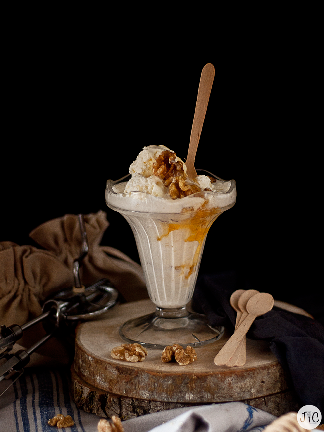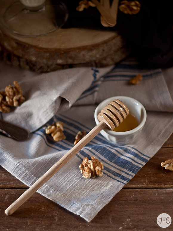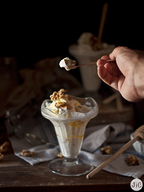 - Servimos en copas de helado alternando con un poco de miel y decoramos con nueces. ¡Os va a encantar!
