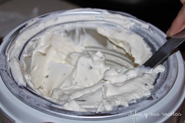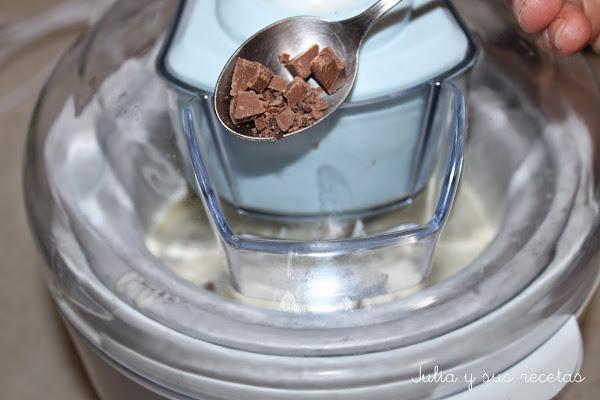 Ponemos la heladera en funcionamiento y echamos la crema de queso bien fría. Recordad que el recipiente debe estar en el congelador 24 horas mínimo antes de su uso. Le vamos echando trocitos de chocolate con leche mientras se va haciendo el helado.