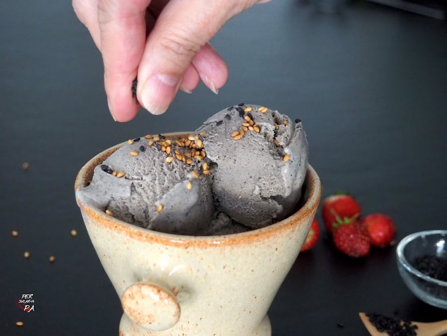 Al servir colocar dos o tres bolas en un bol o vaso pequeño y espolvorear por encima semillas de sésamo negro tostado y de sésamo blanco caramelizado.