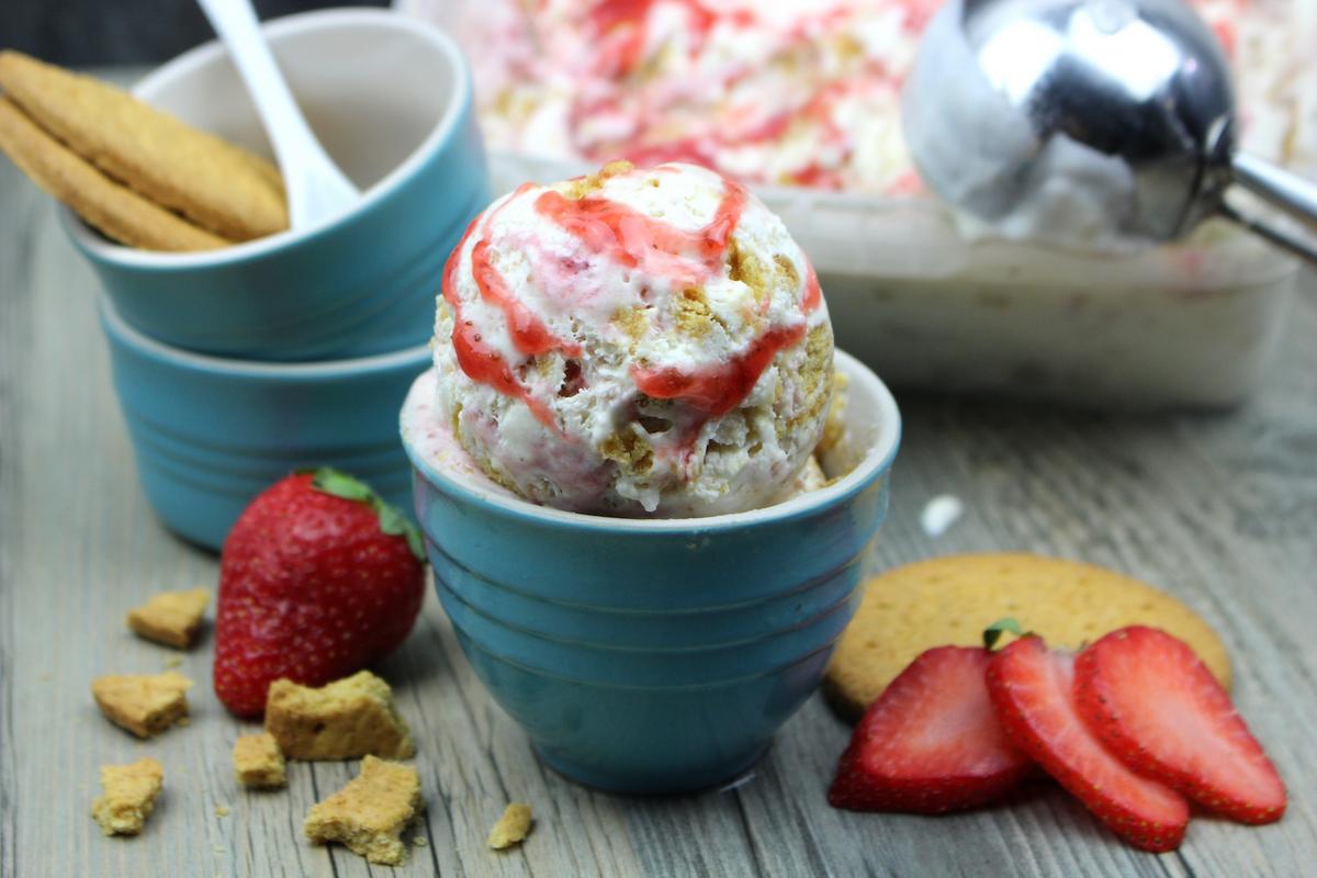 Delicioso helado de cheesecake con trocitos de galleta y mermelada de fresa casera