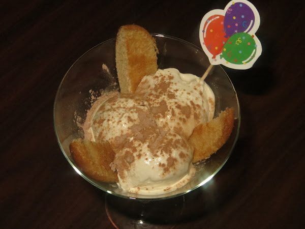 Pasado el tiempo echamos a la heladera y lo dejamos durante 25 minutos para que os quede un helado cremoso y luego llega el momento de montar vuestra copa de helado. Partís un bizcocho en cachos los mojáis en café y los ponéis en el fondo de la copa, añadís dos o tres bolas de helado, decoráis con otro bizcocho partido en cachos y espolvoreáis un poco de cacao en polvo por encima y listo para servir.