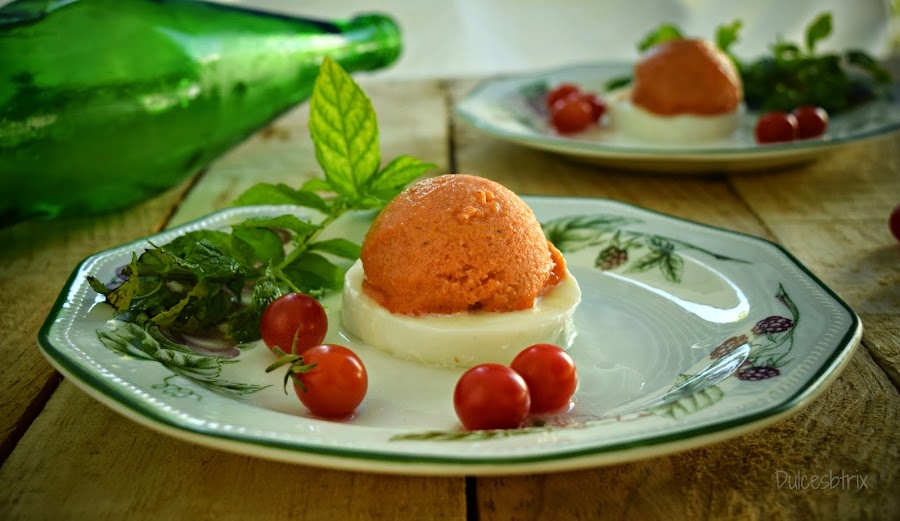 Para servirlo cortamos unas rodajas de mozarella fresca en el plato y con una cuchara de helado, sacamos y colocamos una bola sobre la rodaja del queso, decoramos al gusto y le ponemos un hilo de AOVE SUPREMO que no puse hasta después de hacer la foto y que le da un toque superior y un color verde precioso.