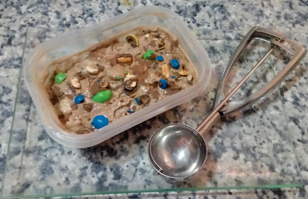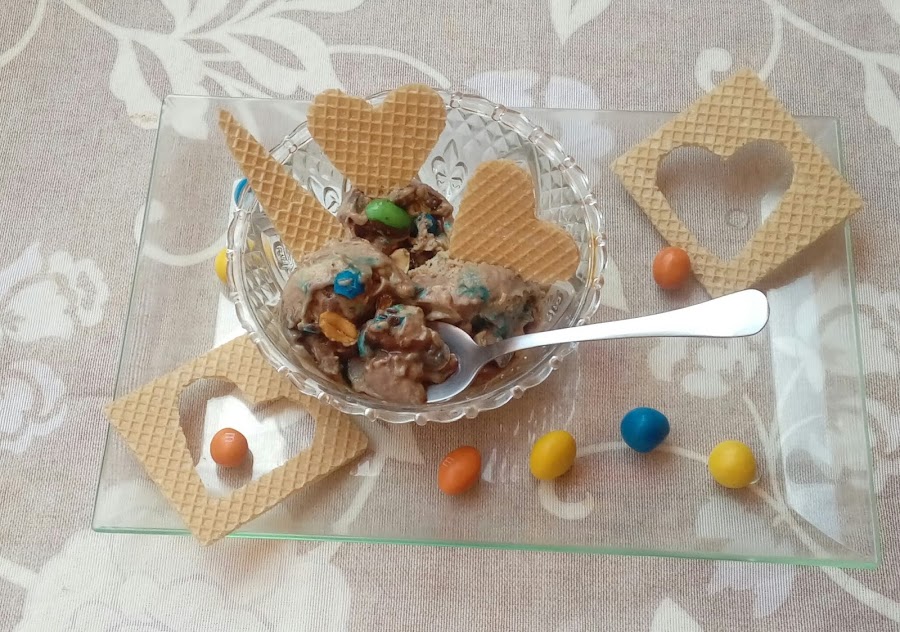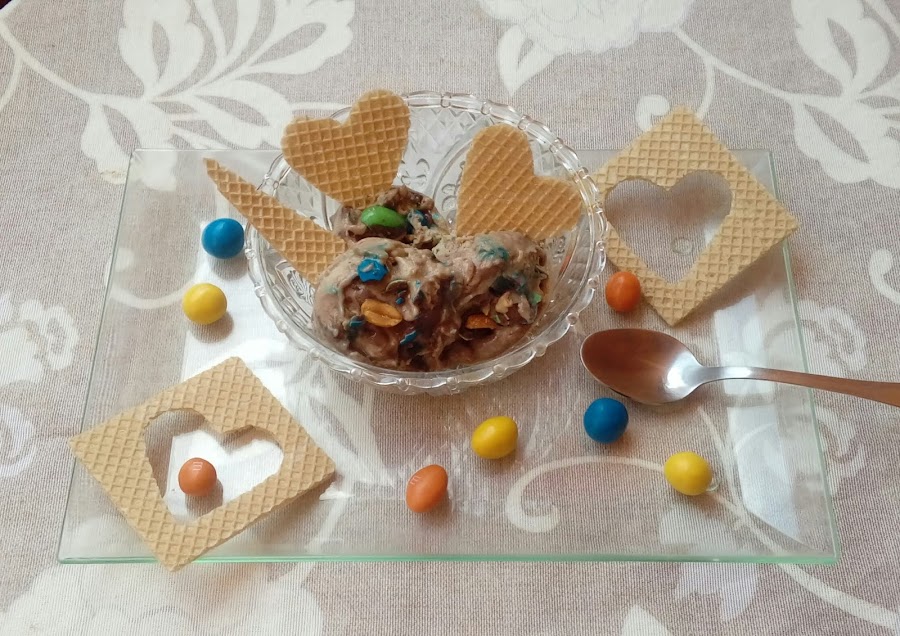 Cojemos el puñado de m&ms y los machacamos, los mezclamos con el helado, li y metemos en el congelador y cada 15 minutos lo removemos, así durante 3 veces y se deja congelar.