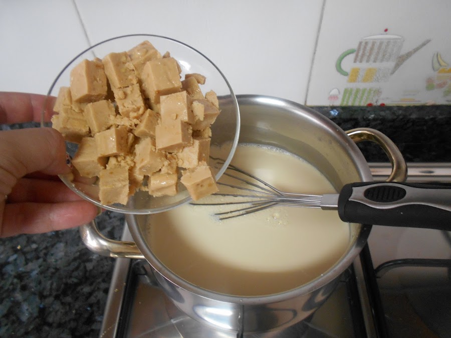 Incorporamos la mitad de la tableta de turron cortada en trocitos La otra mitad la reservaremos para los tropezones