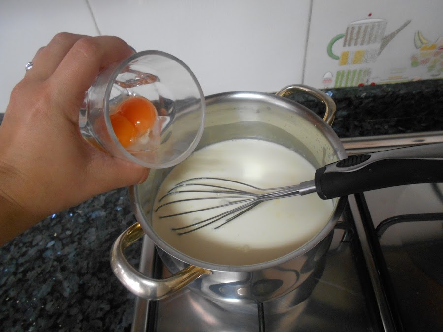 Añadimos la nata (crema de leche), las yemas y la miel o el azucar. Mezclamos muy bien.