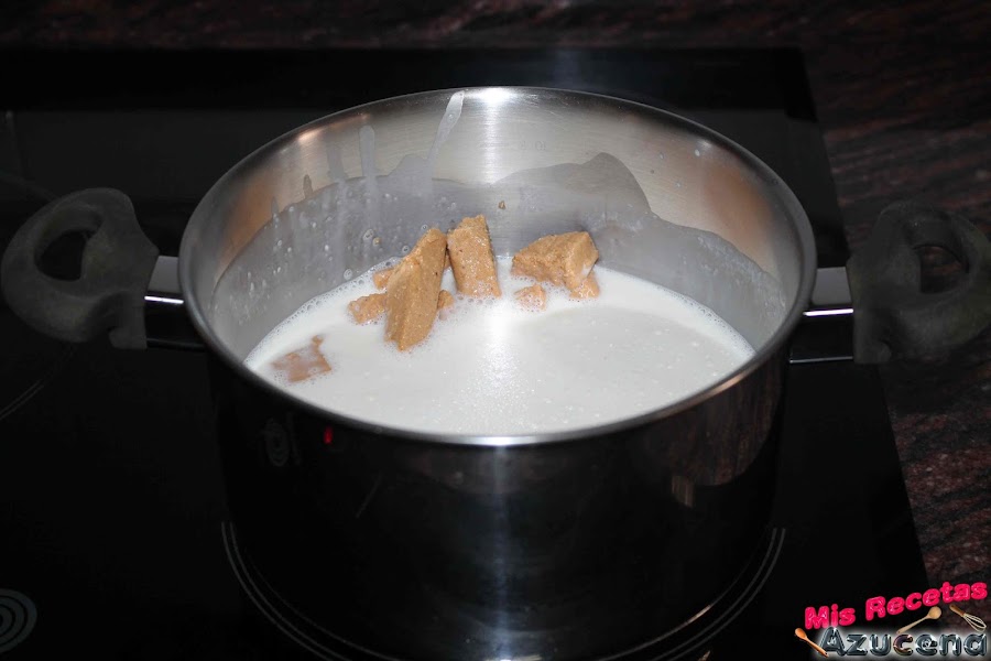 Después continuaremos poniendo un cazo al fuego a fuego medio bajo con la leche, la nata (crema de leche) y el extracto de vainilla, lo templaremos un poco para continuar añadiendo el turrón en trozos. Con ayuda de unas varillas iremos removiendo hasta conseguir que el turrón se nos disuelva por completo, necesitaremos entre 8 y 10 minutos, una vez disuelto retiremos del fuego y apartamos.