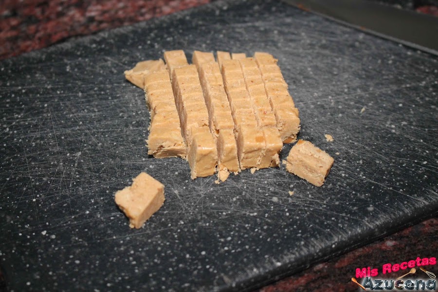 Cogemos el turrón la troceamos y de los 300gr reservaremos 50 gr para poner en trocitos.