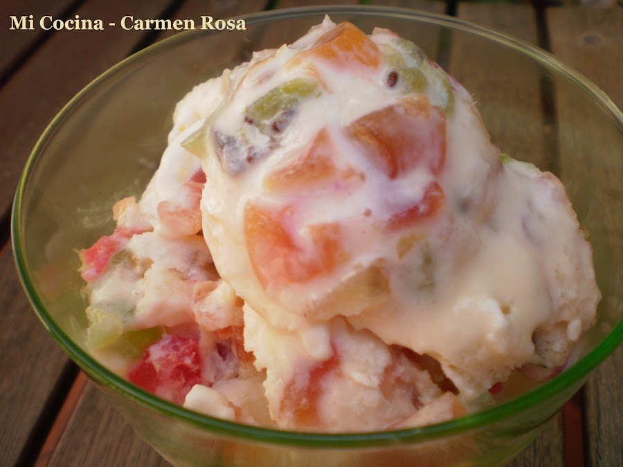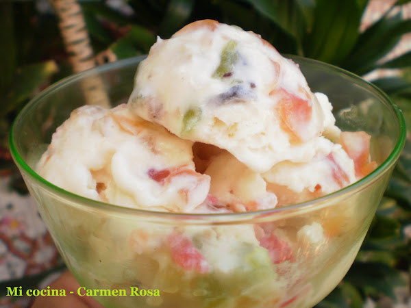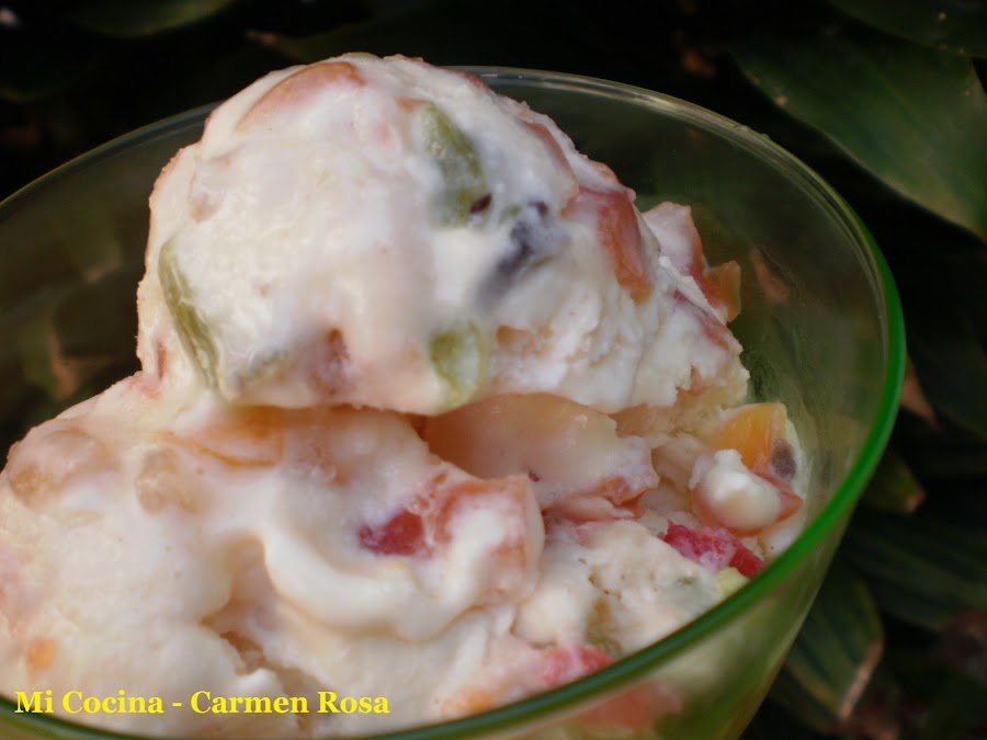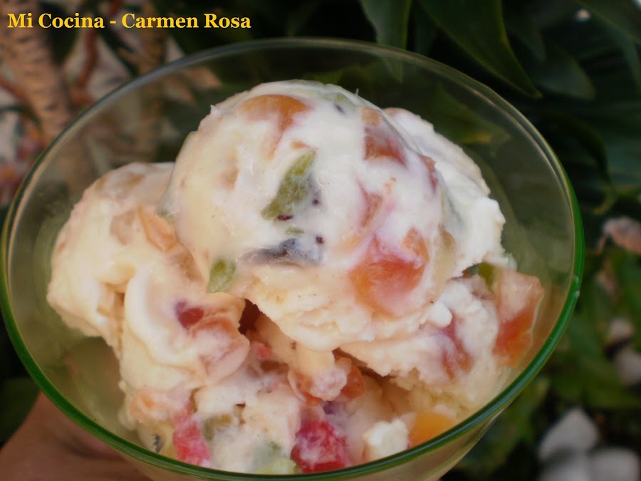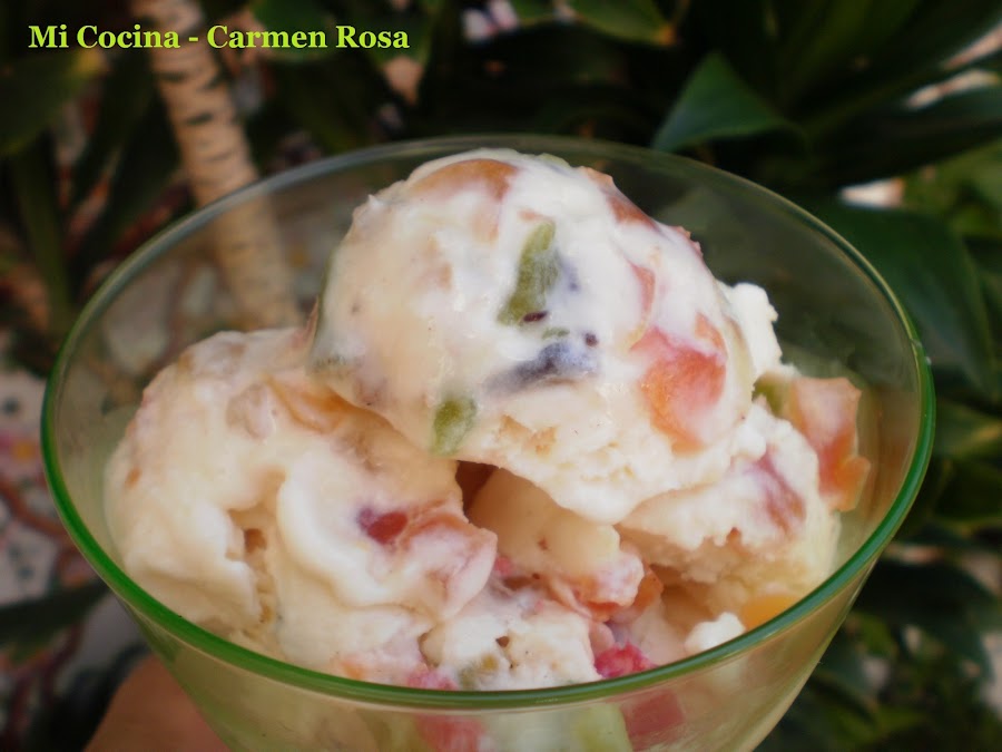 Un poco antes de que el helado esté listo, añadir las frutas confitadas y dejamos que se mezclen bien con el helado.
