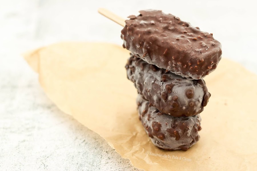 Déjalos un momento en el congelador para que termine de endurecer el chocolate.Nota: Al momento de comer el helado, te recomiendo que los saques unos 10 a 15 minutos antes, para que la mezcla de quark y vainilla esté suave.
