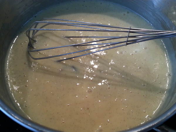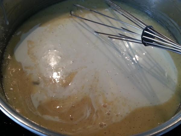 6. - Volvemos a echar en el cazo y ponemos a fuego lento, removiendo constantemente, hasta que espese y se nos haga una crema inglesa, que es una especie de natilla un poco más líquida.