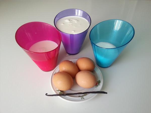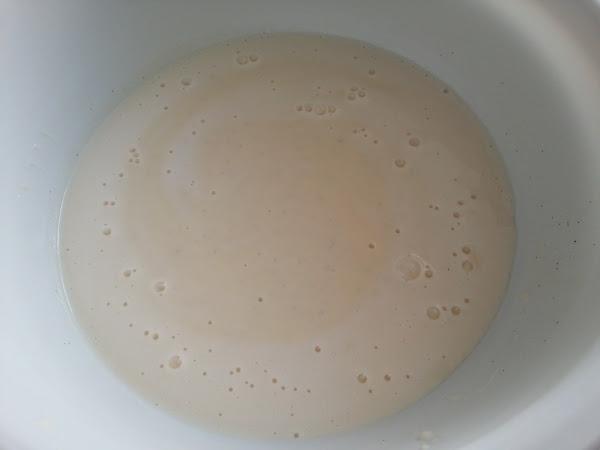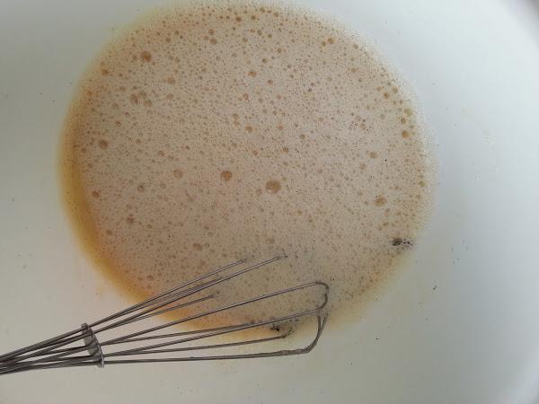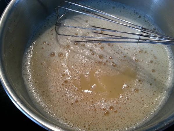 5. - Añadimos la infusión de leche a las yemas, poco a poco y batiendo bien, para que no nos cuajen las yemas.