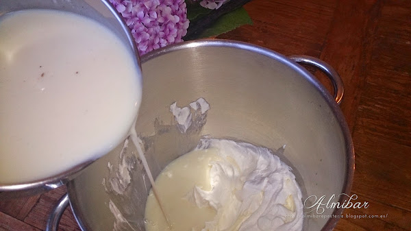...incorpora la mezcla de leche fría anterior (3ºC) poco a poco a la nata (crema de leche), en forma de hebra fina, que caiga y se integre simultáneamente en la nata montada (crema de leche)...