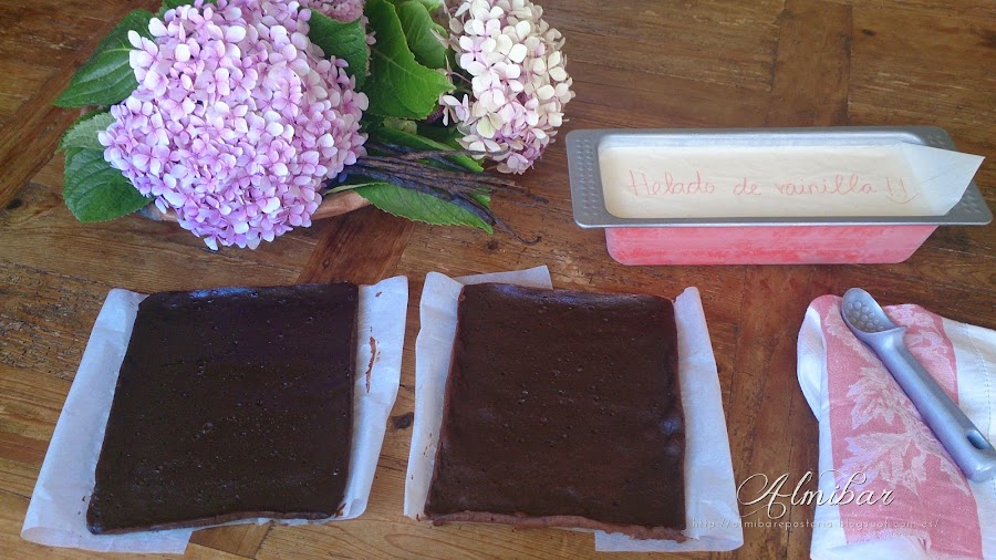 ...colocas el brownie relleno de helado de vainilla en un papel antiadherente...