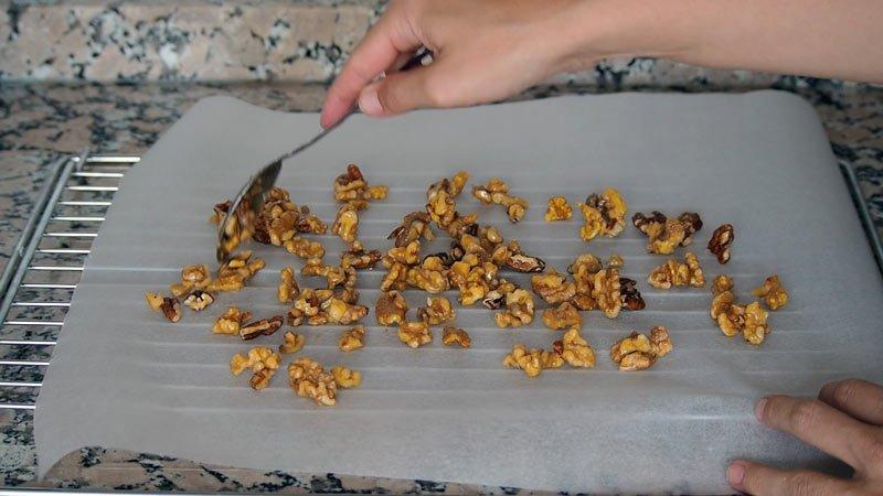 Cuando el horno esté caliente, metemos las nueces y horneamos durante unos 5-6 minutos o hasta que veas que empiezan a tostarse.
