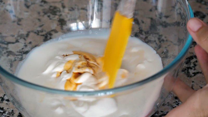 Luego incorporamos el yogur natural tipo griego. Me gusta la cremosidad de este yogur, aunque puedes usar otro tipo.