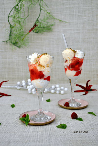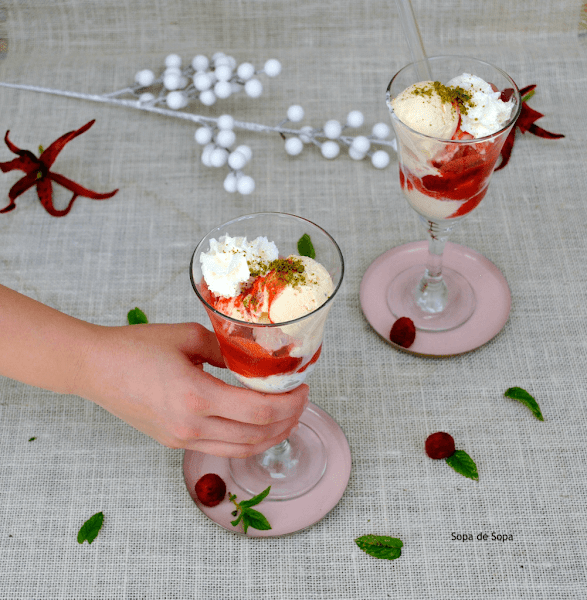 Para servir, poner 2-3 bolas de helado por comensal en copas con la salsa de las frambuesas caliente, la nata montada (crema de leche) y los pistachos espolvoreados por encima.