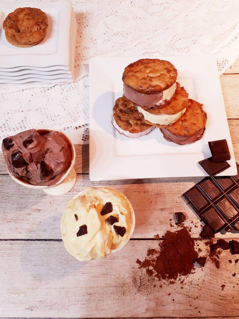 Hay que tener en cuenta que al no llevar grasa ni aditivos, se derrite muy fácilmente, por lo que recomiendo que si no lo consumís en el momento, lo guardéis en el congelador hasta el momento de servir. Como veis en la foto, lo he servido con galletas caseras de chip de chocolate y ha quedado más que delicioso (tenéis la receta de las galletas pinchando aquí)
