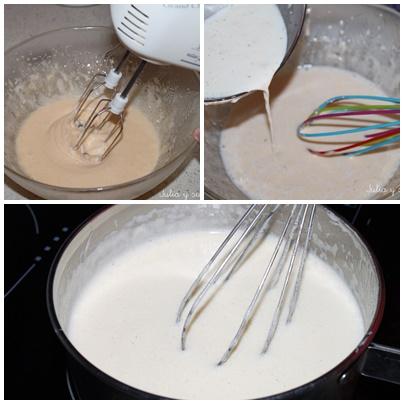 Batimos las yemas de huevo con los azúcares hasta que blanqueen. Le añadimos la leche y lo ponemos al fuego hasta que espese dándole vueltas continuamente para que no se pegue. Dejamos que se enfríe completamente.