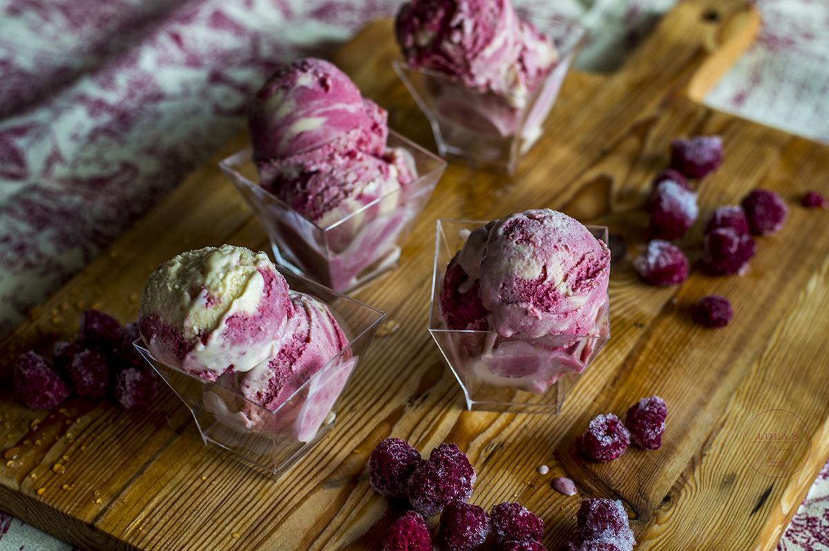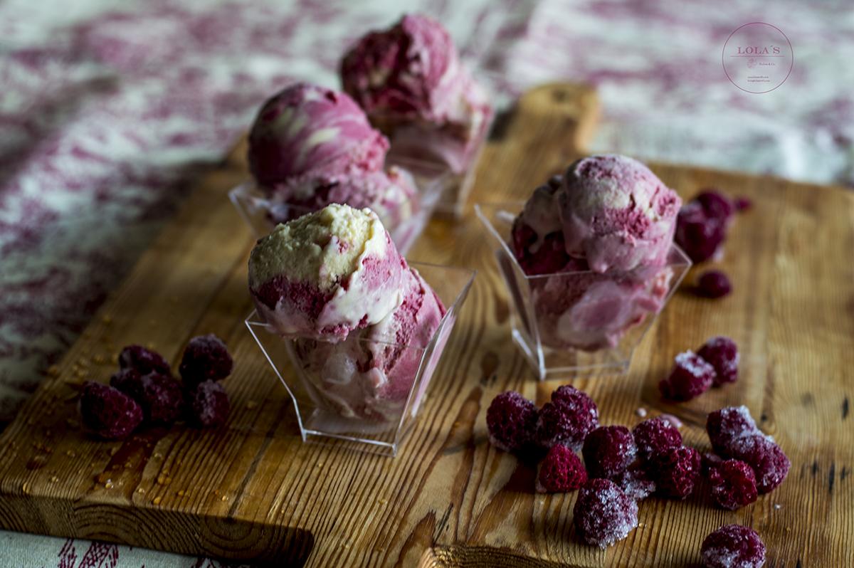 Sin heladera: coloca cada mezcla en recipientes separados y mete en el congelador durante unas 2 horas. Saca del congelador y bate, vuelve a meter en el congelador una hora. Vuelve a sacar y a batir, mete en el congelador pero esta vez hazlo con los dos helados en el mismo recipiente intercambiado en capas (vainilla, frambuesas, vainilla, frambuesa….)