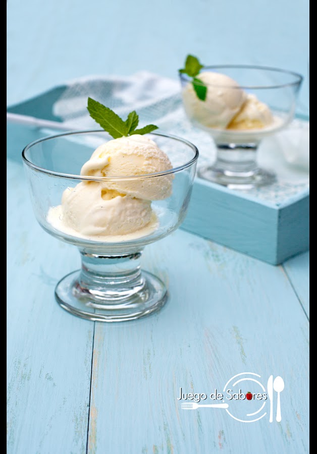 Uno de los méritos de este helado de vainilla ha sido hacerlo en uno de los días más tórridos de este mes de julio de récord por lo que se refiere a las temperaturas. Mira que hay días en el año para ponerse hacer un helado, pues creo que elegimos el peor. Nos pusimos de los nervios comprobando que casi no había tiempo material para depositar la bola de helado y hacer la foto porque, inmediatamente, aquélla empezaba a derretirse. Nos entraron los sudores que, dicho sea de paso, eran sudores al cuadrado porque aquel día era de récord Guinness. Total, que disparamos cuatro fotos y nos zampamos el helado de vainilla que nos habíamos ganado a pulso y que, por cierto, estaba riquísimo. Tras él, y el helado de cereza que publicamos hace unos días, vendrán otros muchos, porque se trata de recetas divertidas y porque además los helados pueden comerse durante todo el año.
