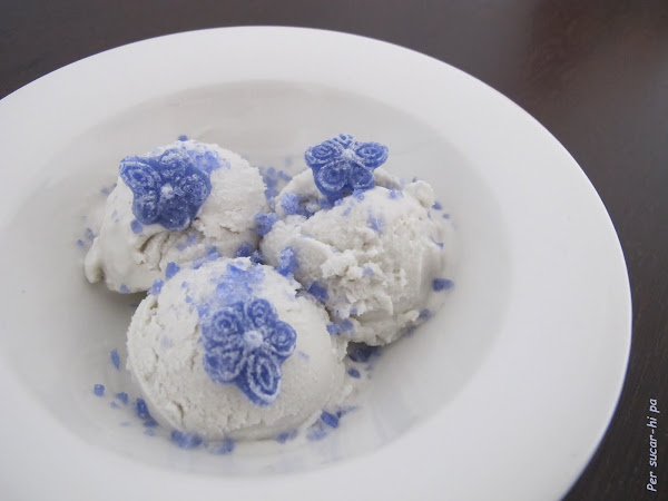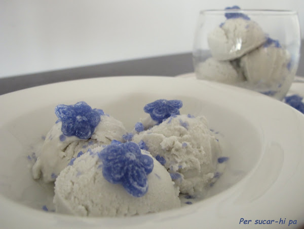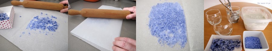 Para la decoración del helado preparar un granulado de violetas. Para ello machacar algunos caramelos entre dos hojas de papel de horno con ayuda de un rodillo hasta que tengan el grosor deseado.