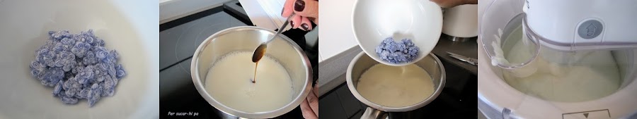Poner un cazo en el fuego y calentar la leche. Añadir los caramelos de violetas, remover hasta que se disuelvan completamente. Añadir el extracto de vainilla, la sal y mezclar bien. Retirar del fuego, añadir la nata (crema de leche) y remover para integrar toda la crema. Colarlo y colocarla en un recipiente con tapa. Dejarlo templar y enfriar la crema en la nevera mínimo doce horas para que este bien fría.