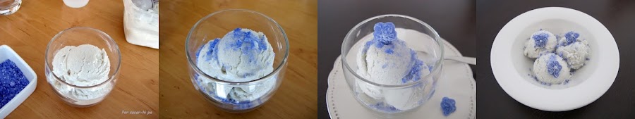 Colocar dos o tres bolas de helado en un vaso, o en un bol, esparcir por encima un poco del polvo de caramelos y alguna pieza entera. Listo para disfrutar.