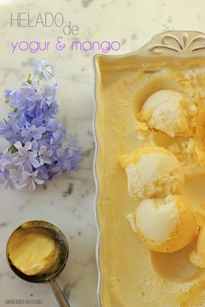 Ahora disfruto también, de tener en mi trabajo horario de verano, de estar en casa con mis niñas y con mi marido, de la piscina, de las escapadas a la playa, de comer mucho (aunque cuando me miro al espejo me entra la angustia, jejejeje). Y entre las cosas ricas que preparé estos días está este delicioso Helado de Yogur y mango.