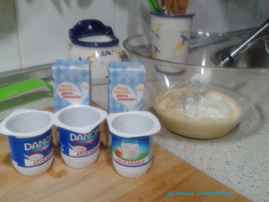 Las yemas de 3 huevos, cuatro yogures (he usado azucarado de la marca Danone), dos cucharadas pequeñas de azúcar avainillada, 50 grms. de azúcar glas, dos botes de nata (crema de leche) especial para montar.