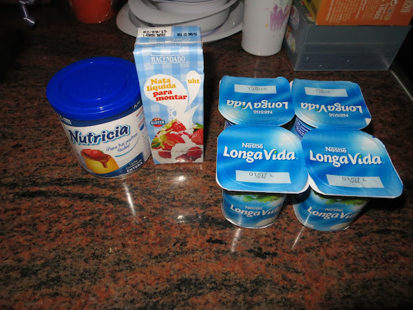 Lo primero que hacemos es montar la nata (crema de leche). Una vez montada batimos los cuatro yogures naturales, le añadimos las cuatro cucharadas soperas de leche condensada y juntamos con la nata montada (crema de leche).