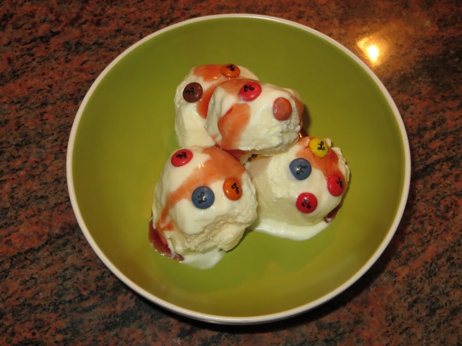 Ahora metemos la mezcla en un recipiente y durante la primera hora le damos vueltas cada 15 minutos, las dos horas siguientes lo hacemos cada 30 minutos y luego lo dejamos mínimo 4 horas para que se congele. Antes de consumirlo sacarlo un poco antes del congelador y adornarlo con lo que más os guste, en este caso mini lacasitos y sirope de fresa.