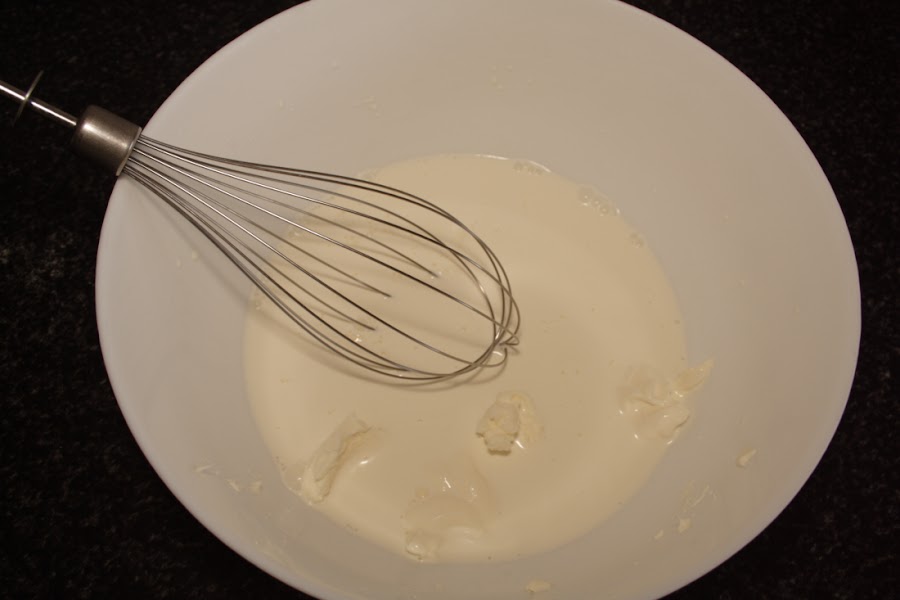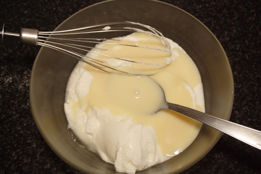 En otro bol ponemos los yogures y los batimos, agregamos la leche condensada y seguimos batiendo.