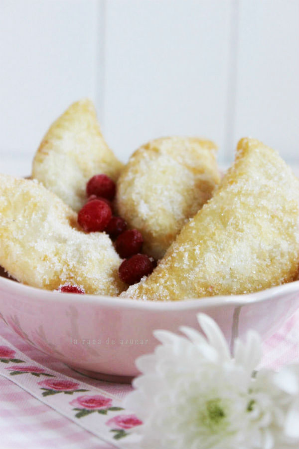 Freír las "empanadillas" de una en una durante un minuto aproximadamente, hasta que el hojaldre se infle y estén doradas. Eliminar el exceso de aceite con papel absorbente, y rebozar en azúcar.