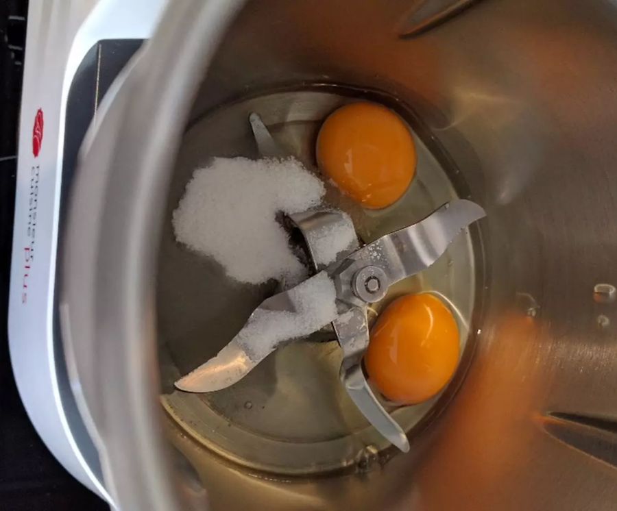 Unas gotas de esencia de vainillaBatimos los huevos con el azúcar durante 3 minutos y velocidad 5