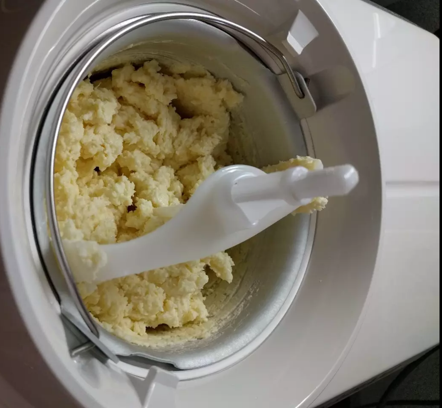 Ponemos el coco rallado y mezclamos a velocidad 3 durante 15 segundos. Volcamos en la cubeta de la heladora