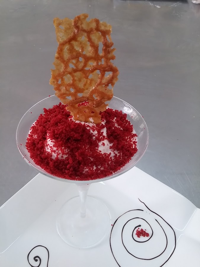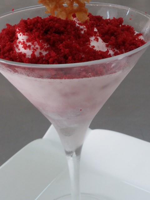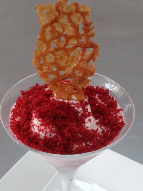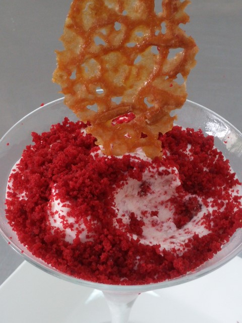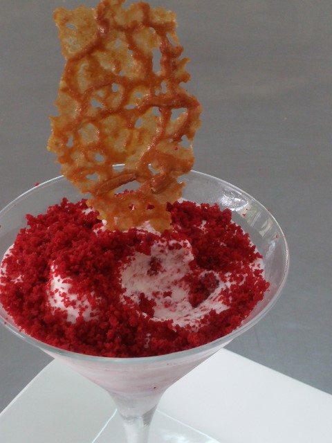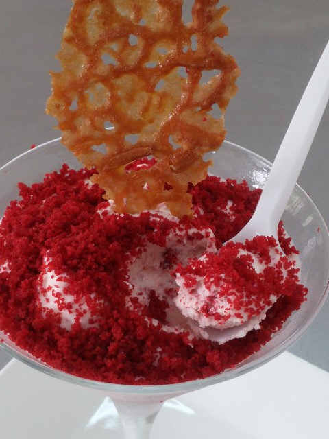 Preparación: Calentar la leche con el azúcar y la glucosa, si se emplea, para diluir bien las dos cosas. Luego poner en un bol y dejar que se enfríe. entonces añadir la dos clases de queso y batir bien. Luego agregar la nata (crema de leche) líquida y mezclar muy bien. Dejar que la mezcla madure en la nevera hasta el día siguiente. Se vuelve mucho mas cremosa. La maduración es un paso fundamental a la hora de preparar un buen helado tanto si se hace con heladora como si no.Poner en un recipiente o pasar a la heladora si se hace sin heladora, es importante batir de vez en cuando para que no cristalice, lo haremos cada cierto tiempo. Cuando esté el helado casi listo incorporar bizcocho terciopelo rojo (red velvet cake) desmigadito. La cantidad a nuestro gusto, pero para mí no demasiado. Reservar un poco de migas para la hora de servir. Remover un poco para encontrar el bizcocho entre la crema de helado. Dejamos en la nevera hasta que esté hecho del todo. A la hora de servir poner en copas,añadir un poco de migas por la superficie y decorar con un crujiente.
