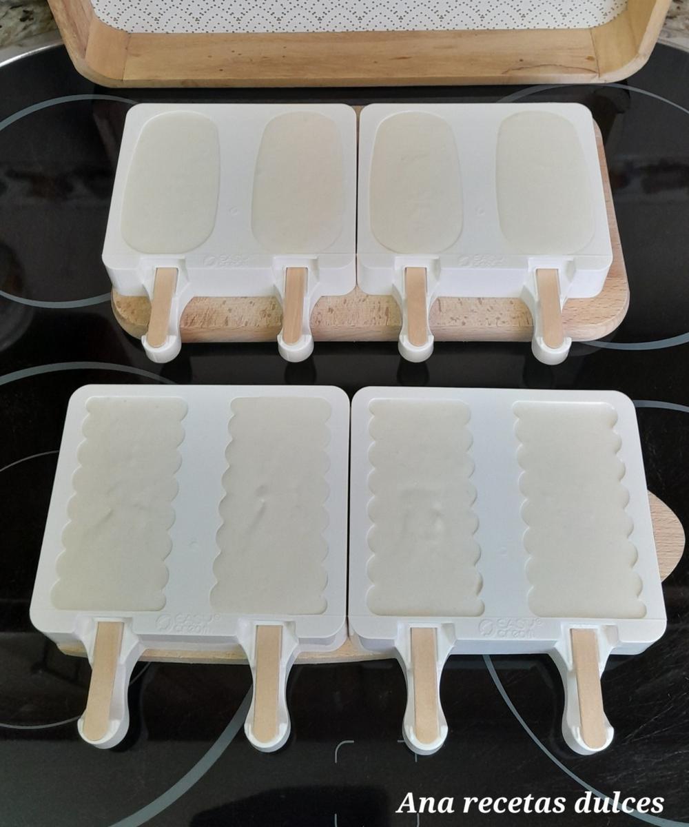 Rellenamos los moldes, insertamos los palitos y tapamos con papel film, metemos en el congelador un mínimo de 8 horas o hasta el día siguiente (en caso de no tener estos moldes, podemos utilizar vasitos desechables).